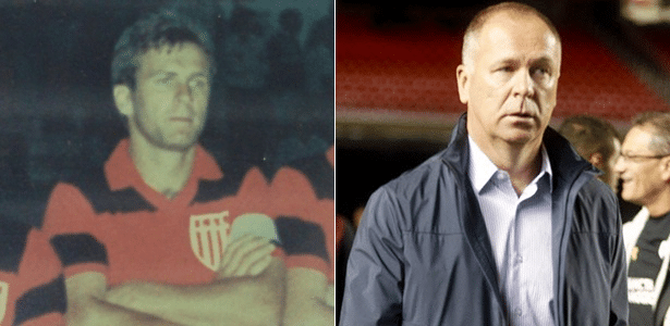 À esquerda, pôster do treinador durante sua curta carreira de zagueiro do Guarani-RS. Ele jogou apenas em clubes amadores.